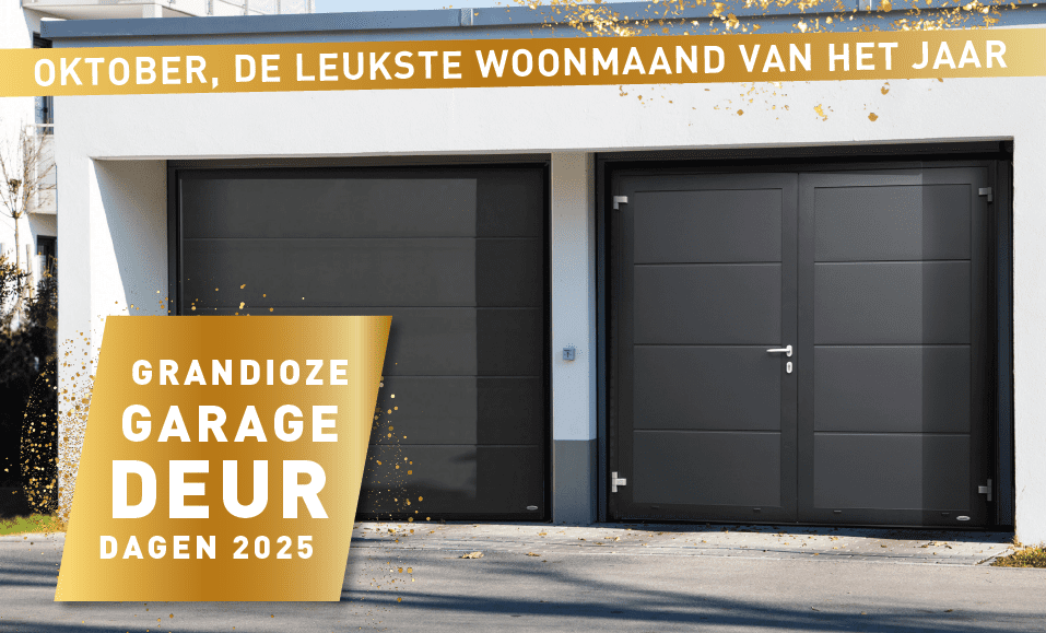 Vrijdag 24 & zaterdag 25 oktober 2025 GRATIS elektrische bediening bij een geïsoleerde sectionaaldeur en 25% korting op openslaande garagedeuren. Inclusief GRATIS LED-verlichtingslijst.
